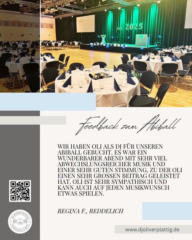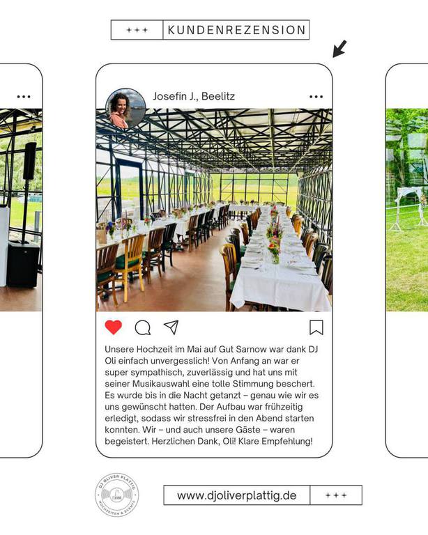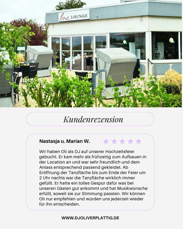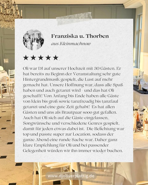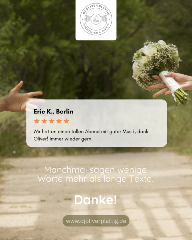 Die hier gezeigten Bewertungen stammen von echten Kunden - viele davon direkt über Google, andere habe ich persönlich, per E-Mail oder über Social Media erhalten. Ich habe die Rückmeldungen lediglich für meine Website grafisch aufbereitet - inhaltlich sind sie unverändert. So bekommst du einen authentischen Eindruck, wie Paare und Gäste meine Arbeit als DJ erlebt haben.
