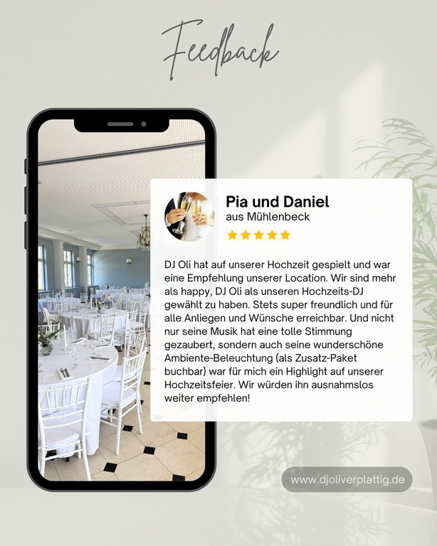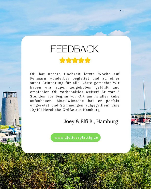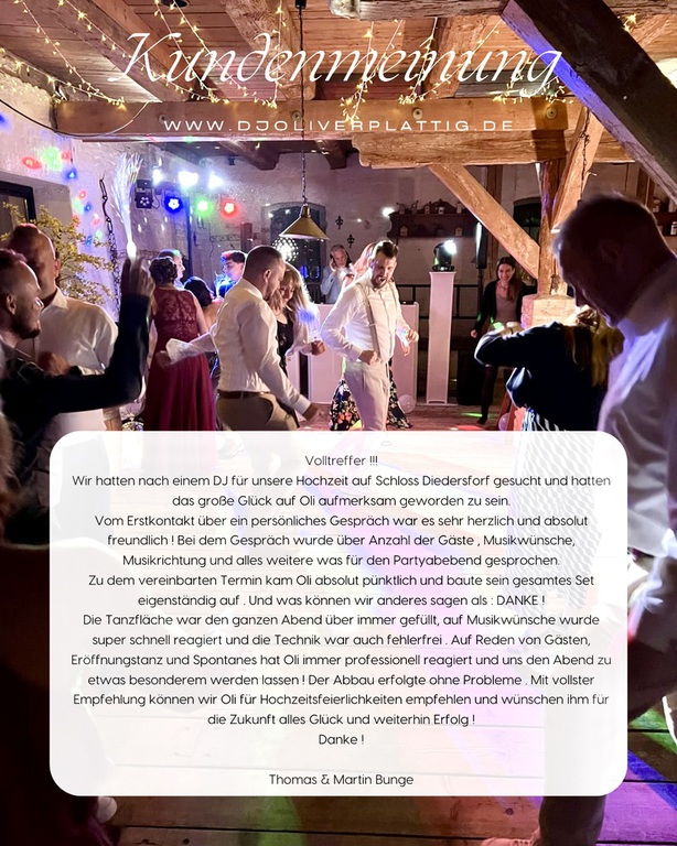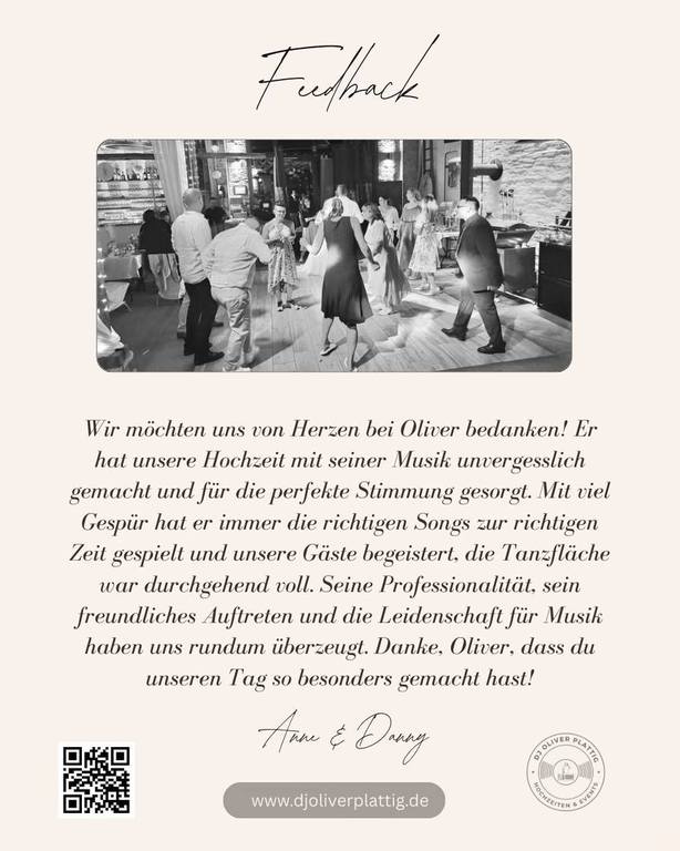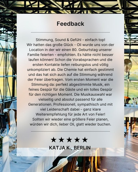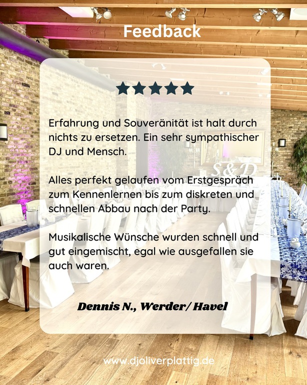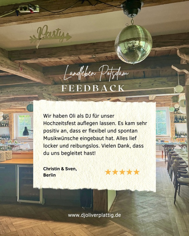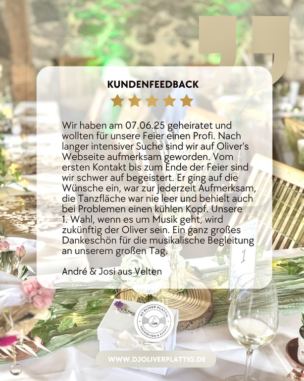 Über ehrliches Feedback von Brautpaaren, Geburtstagsgästenund Firmenkunden freue ich mich jedes Mal sehr. Ihre Stimmen zeigen am besten, wie ich als Hochzeits- und Event DJ arbeite - zuverlässig, professionell und mit dem Ziel, jede Feier unvergesslich zu machen.