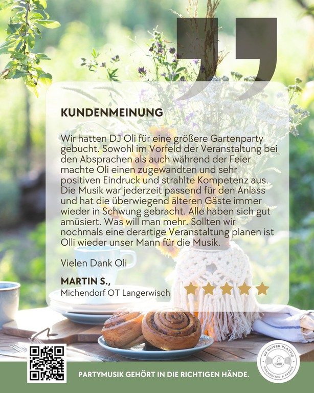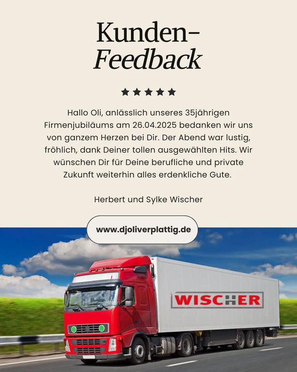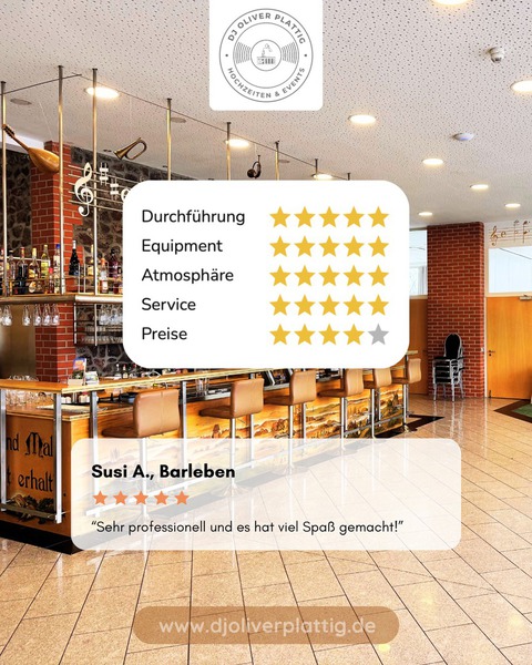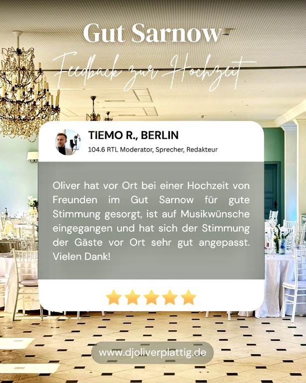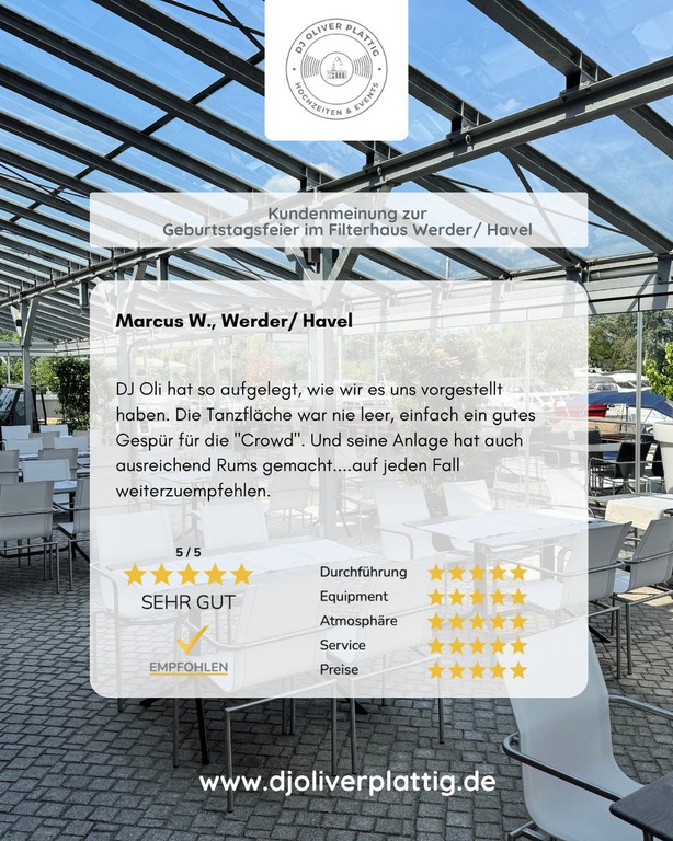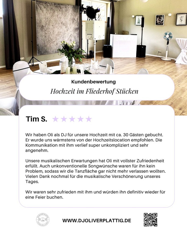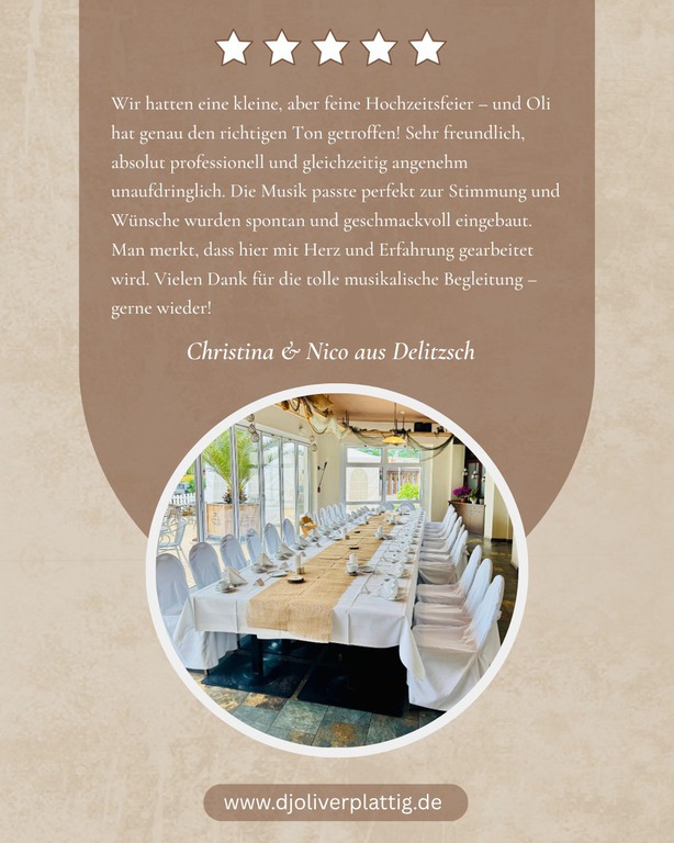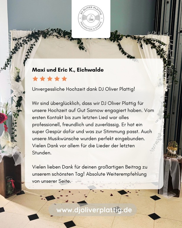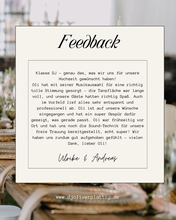 Über ehrliches Feedback von Brautpaaren, Geburtstagsgästenund Firmenkunden freue ich mich jedes Mal sehr. Ihre Stimmen zeigen am besten, wie ich als Hochzeits- und Event DJ arbeite - zuverlässig, professionell und mit dem Ziel, jede Feier unvergesslich zu machen.